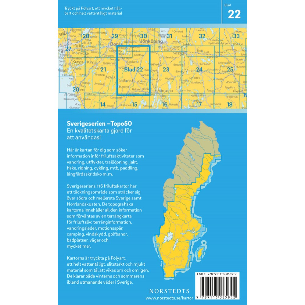 Topografisk karta i skala 1:50 000, innehåller all den information som förväntas av en terrängkarta för friluftsliv: terränginformation, vandringsleder, motionsspår, camping, vindskydd, golfbanor, badplatser, fornlämningar, vägar graderade i olika klasser, järnvägslinjer och mycket mer.