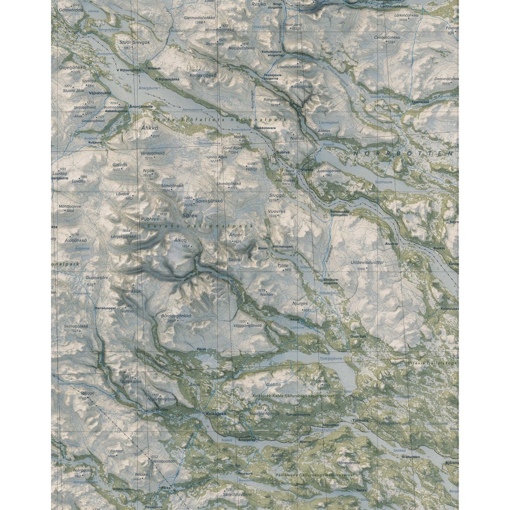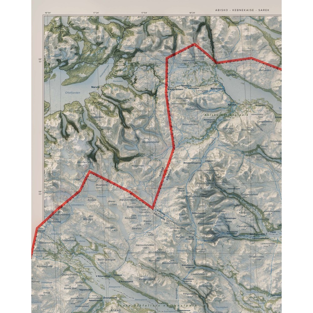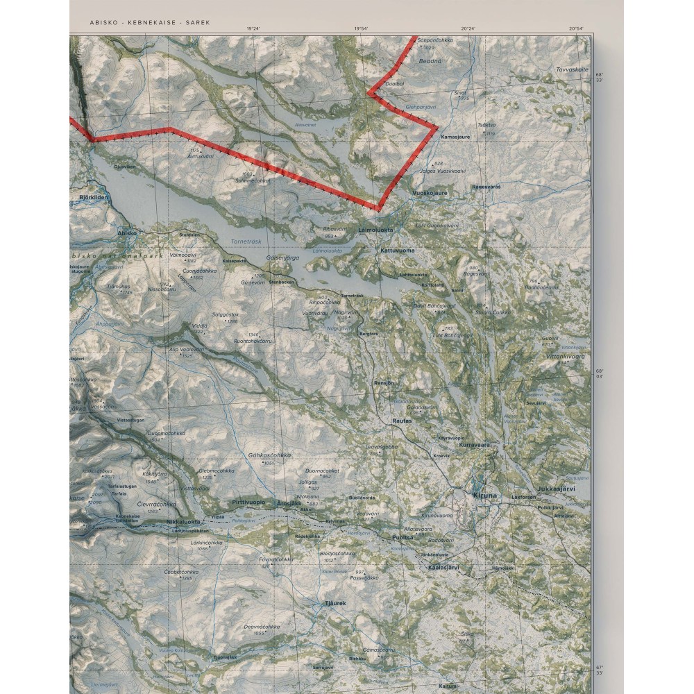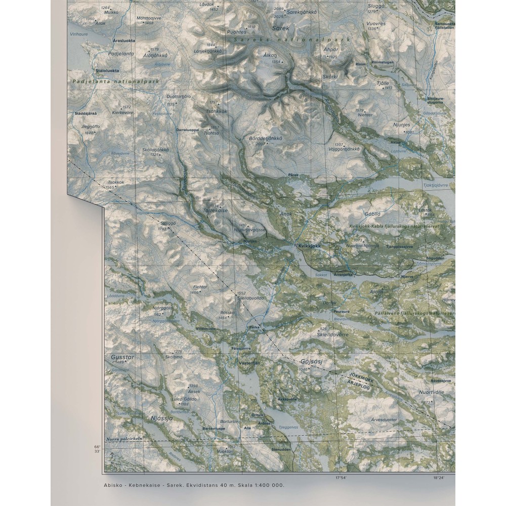 Väggkarta i stående format över Abisko–Kebnekaise–Sarek – ett av Sveriges mest ikoniska och storslagna fjällområden, där dramatiska högfjäll, djupa dalgångar och vidsträckta vildmarker bildar ett sammanhängande och variationsrikt landskap.