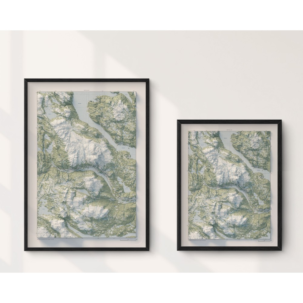 En detaljerad översiktskarta i flera format. 3D-renderad och giclée-tryckt på premiumpapper, vilket skapar en unik 3D-illusion i 2D.