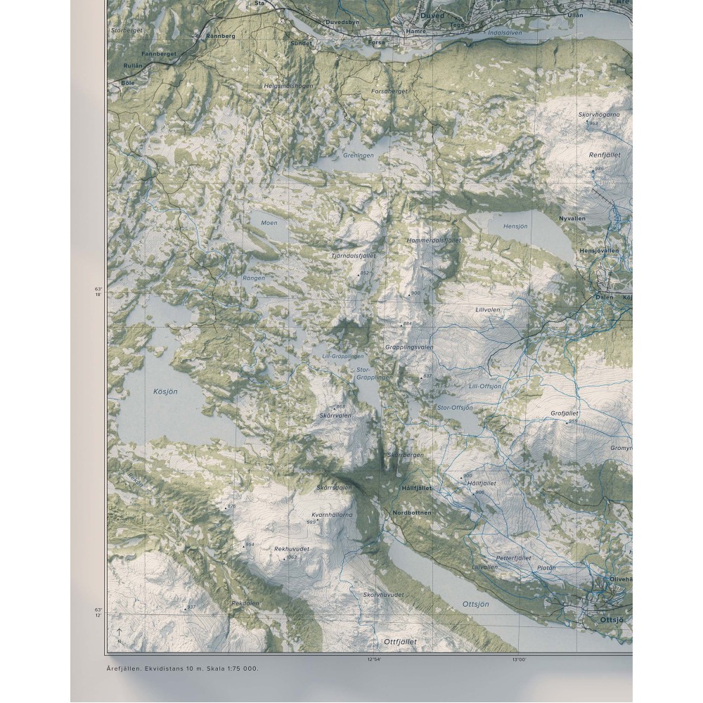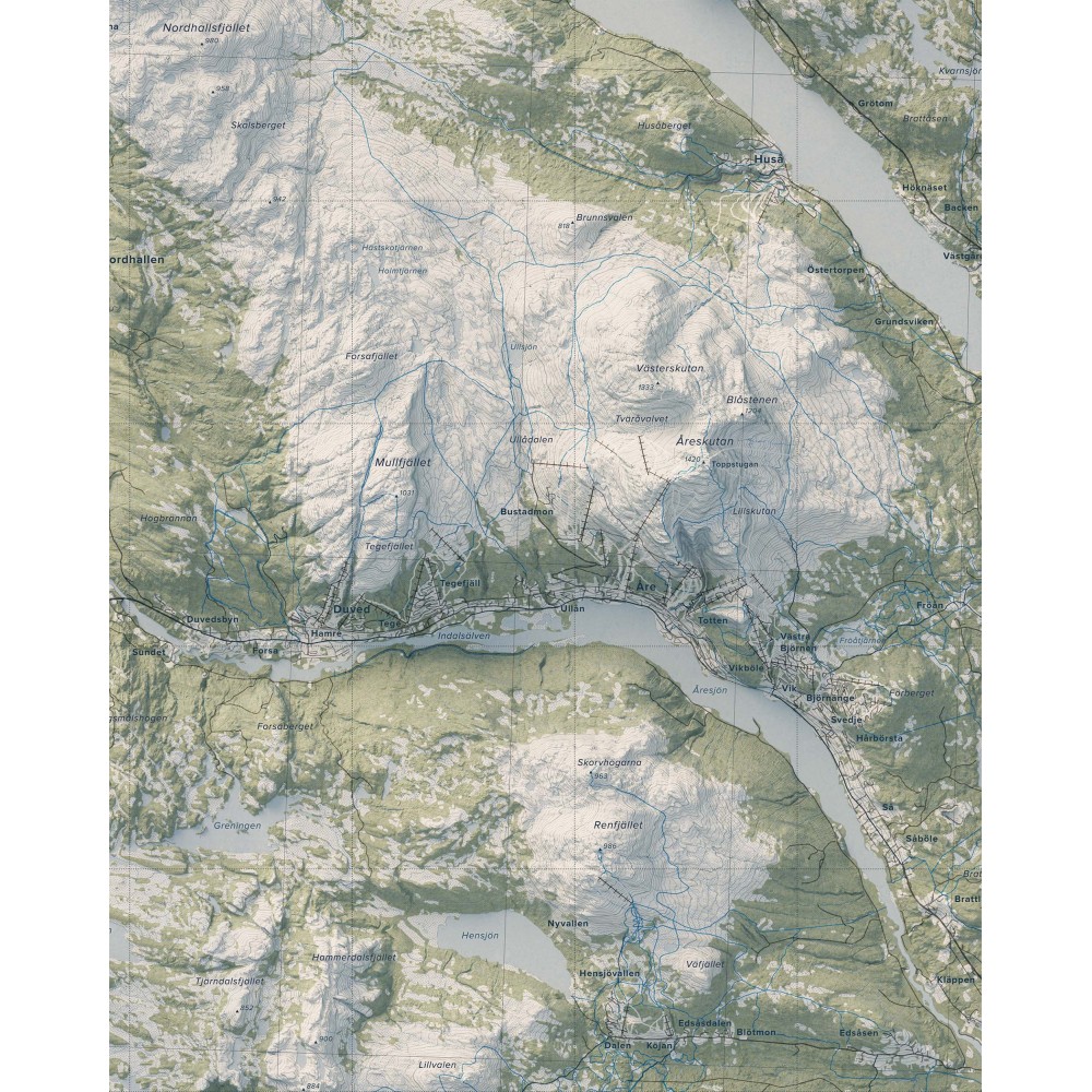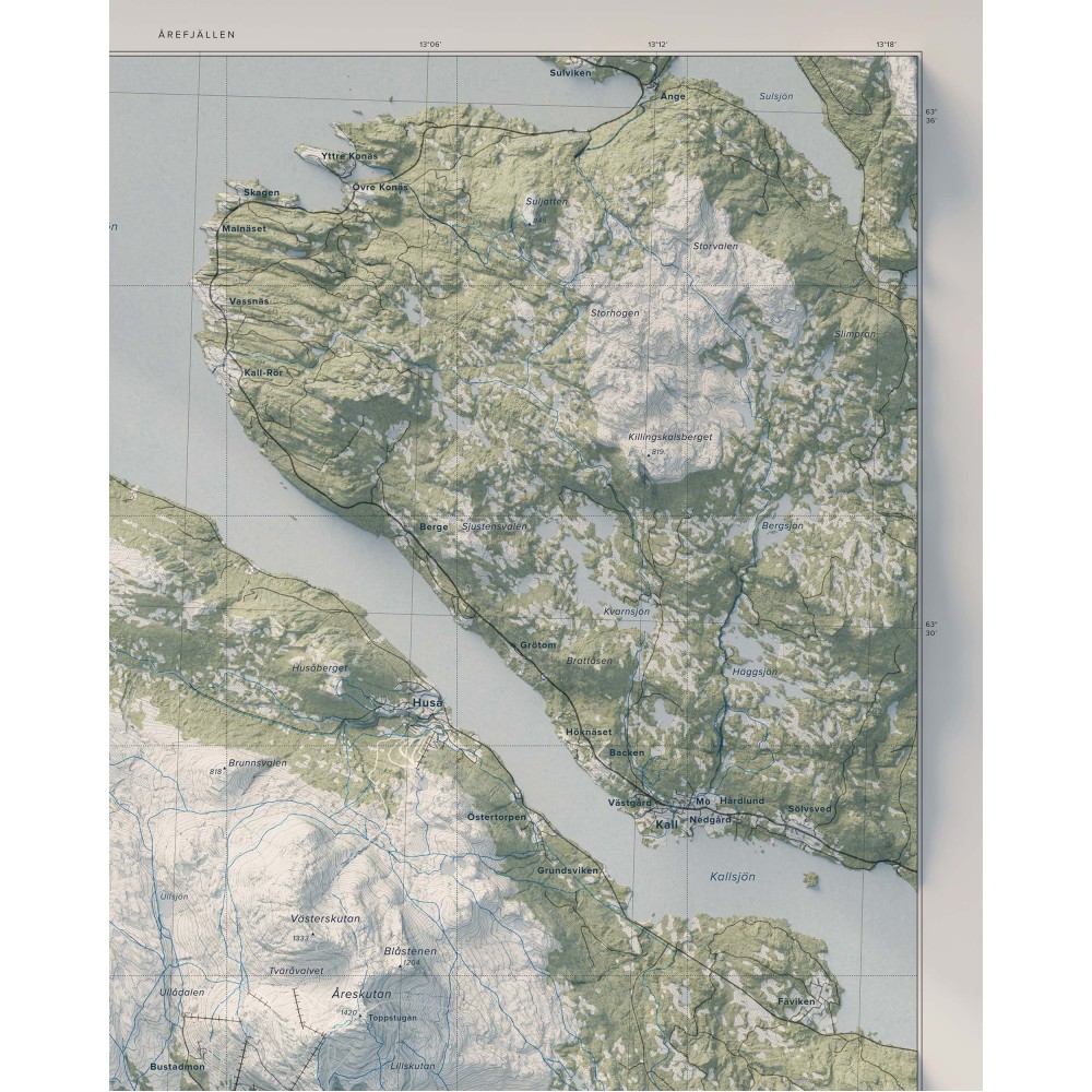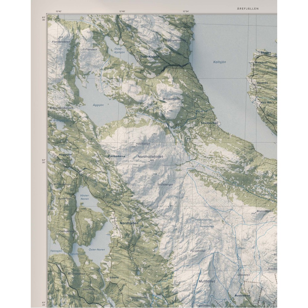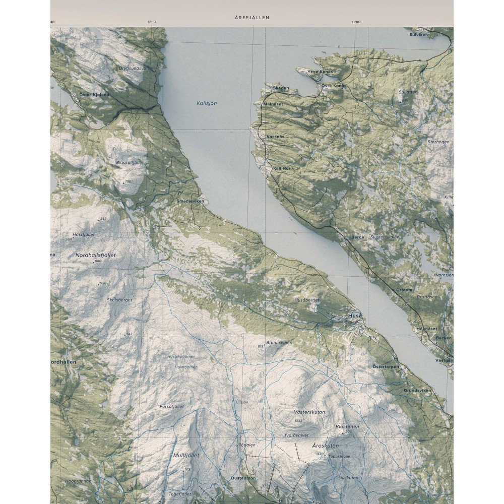 Väggkarta i stående format över Årefjällen – ett av Sveriges mest markanta och variationsrika fjällområden, där höga toppar, djupa dalgångar och tydliga nivåskillnader formar ett dramatiskt fjällandskap.