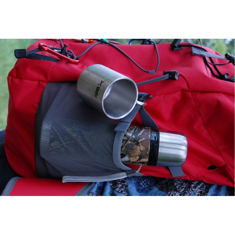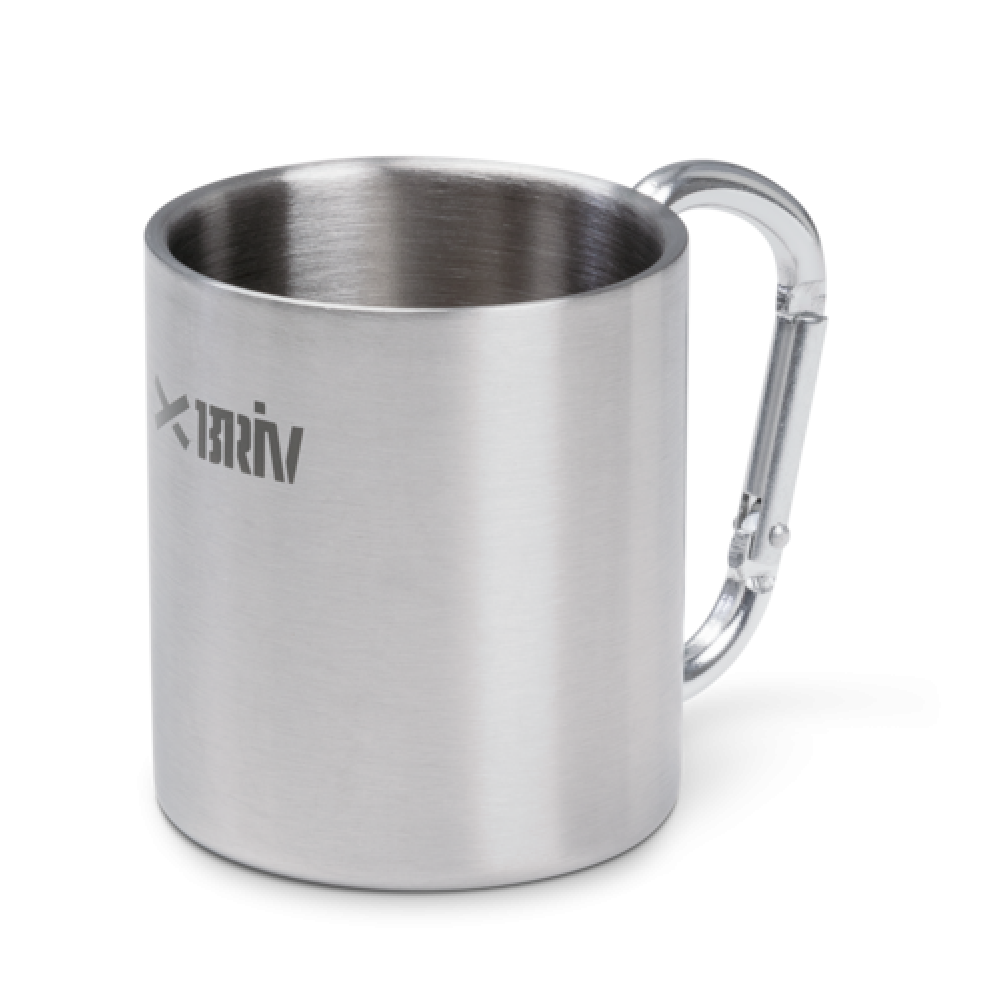 Mugg med praktisk karbinhake för upphängning på t ex ryggsäcken eller i bältet.