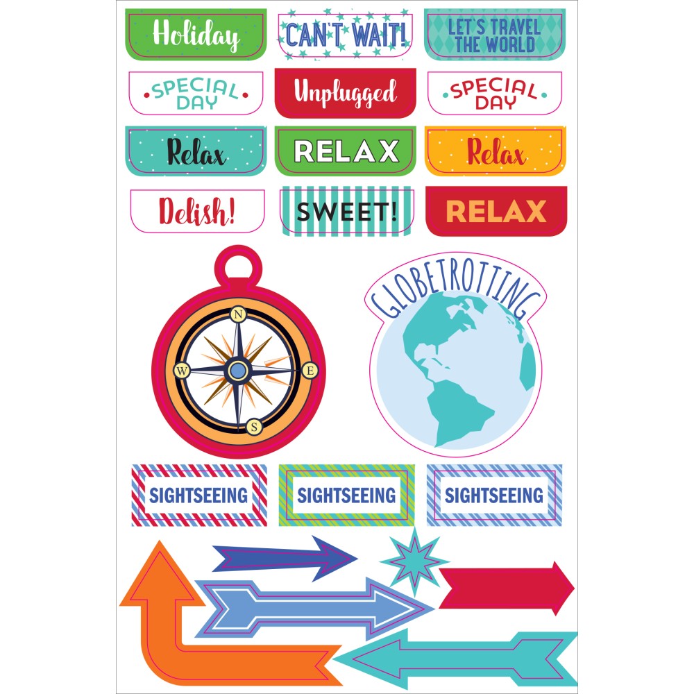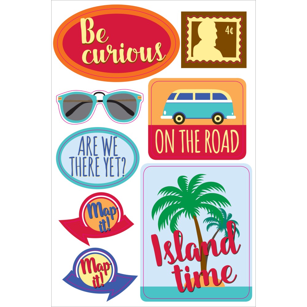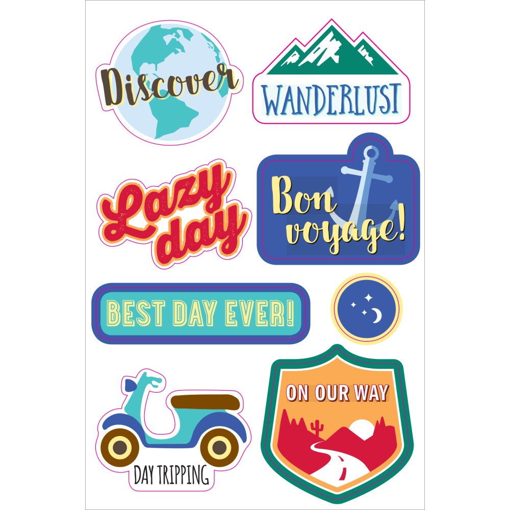 - Stickers include: ''Carpe diem,'' ''Road Trip,'' ''Offline,'' ''Escape,'' ''Wanderlust,'' ''Adventure Awaits,'' ''Scenic Route,'' ''Are We There Yet?'' ''Day 1'' through ''Day 14,'' and many more.