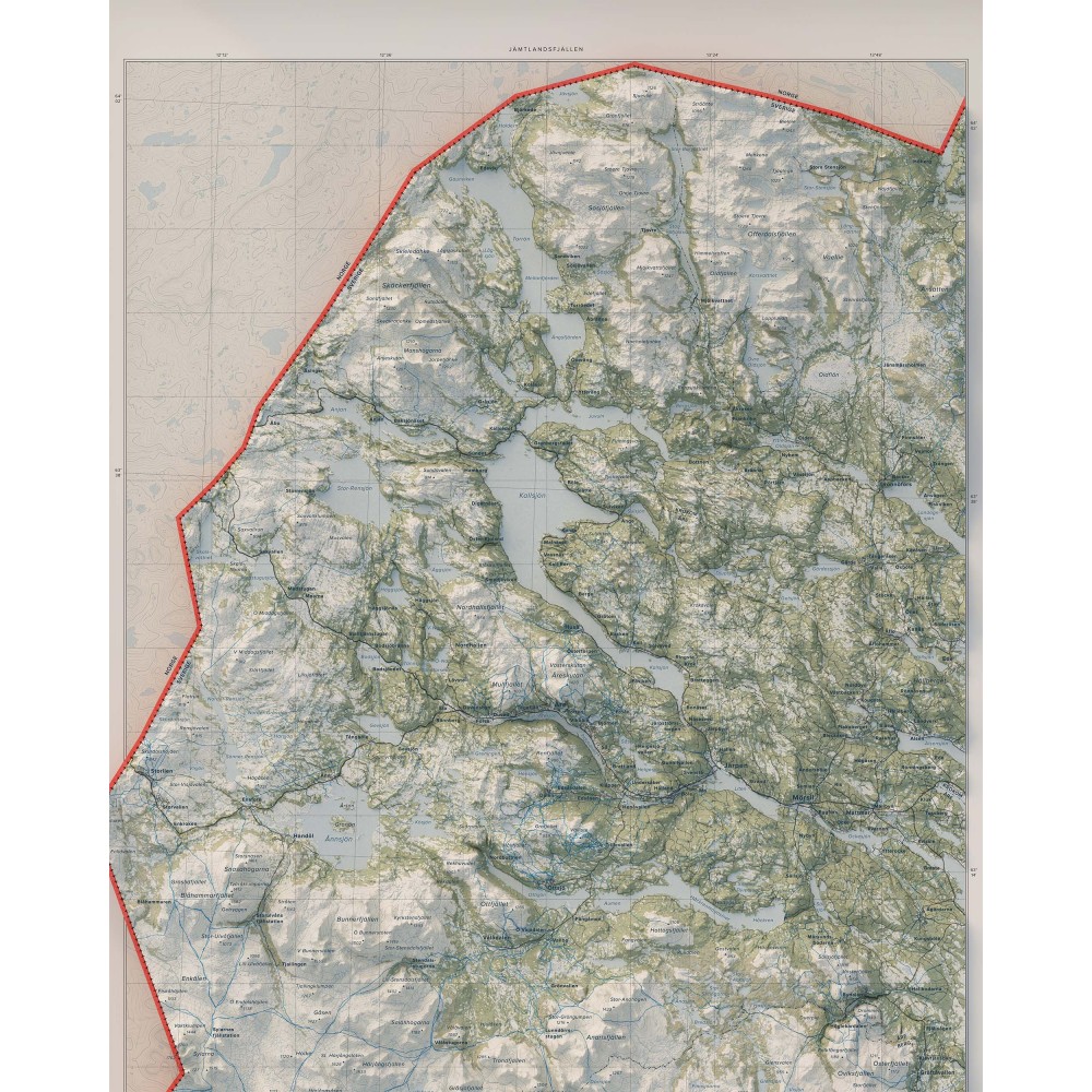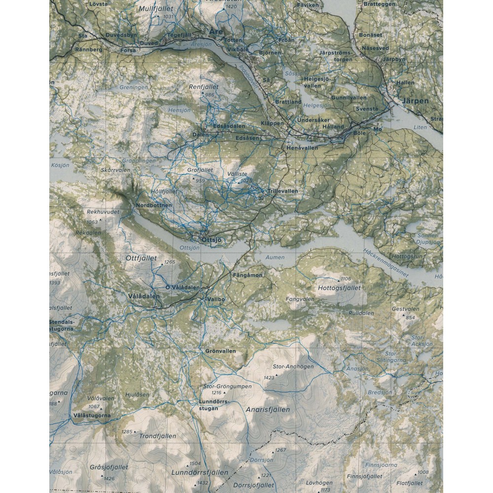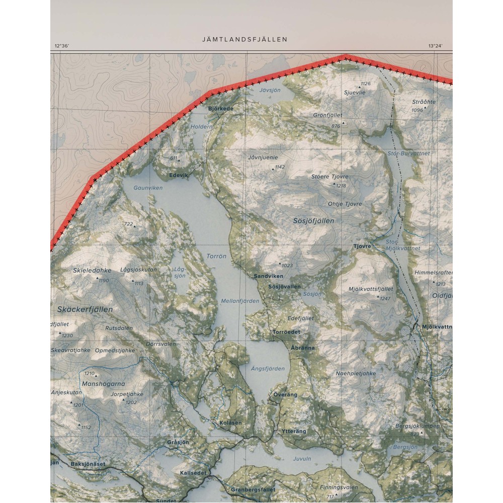 Väggkarta i stående format över Jämtlandsfjällen – ett av Sveriges mest vidsträckta och variationsrika fjällområden, där öppna högfjäll, markanta toppar och långa dalgångar formar ett storskaligt och sammanhängande landskap.