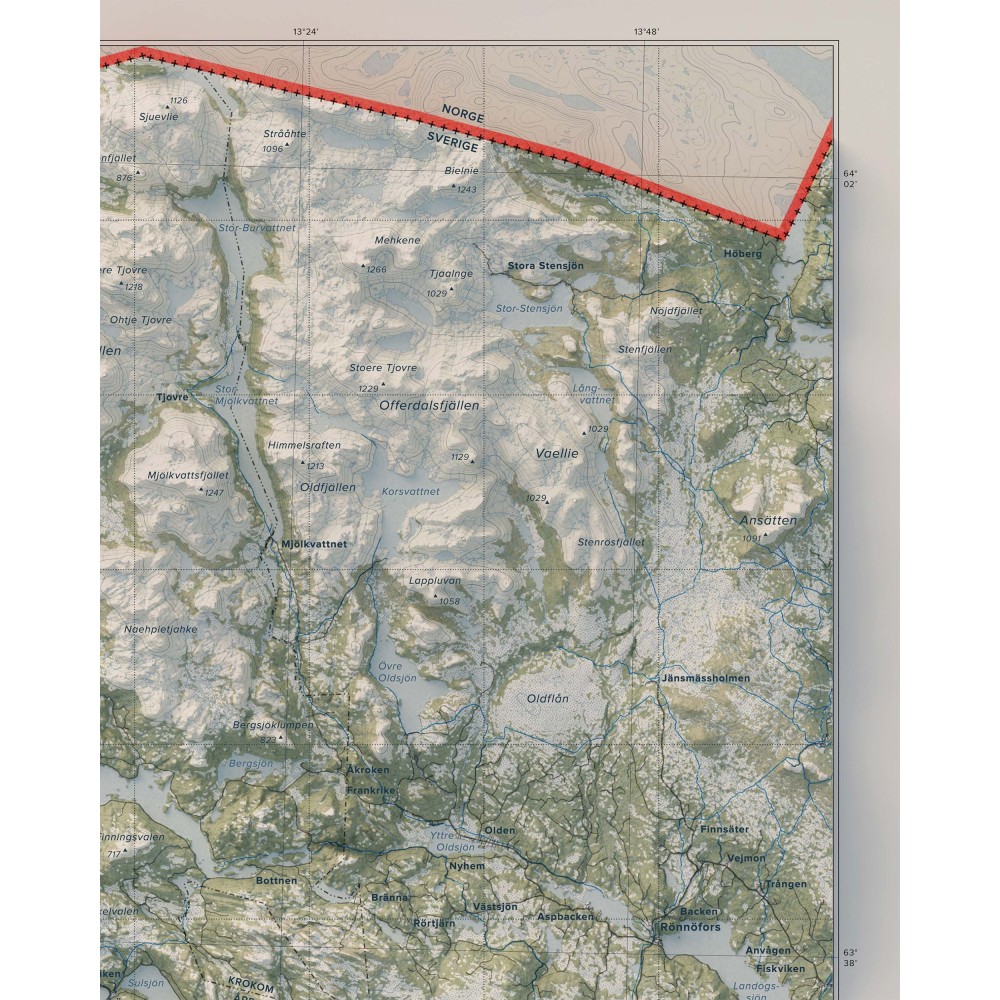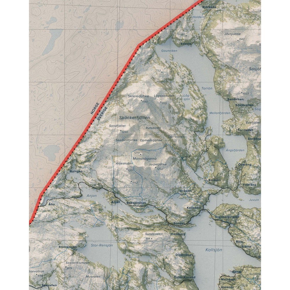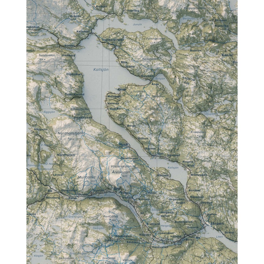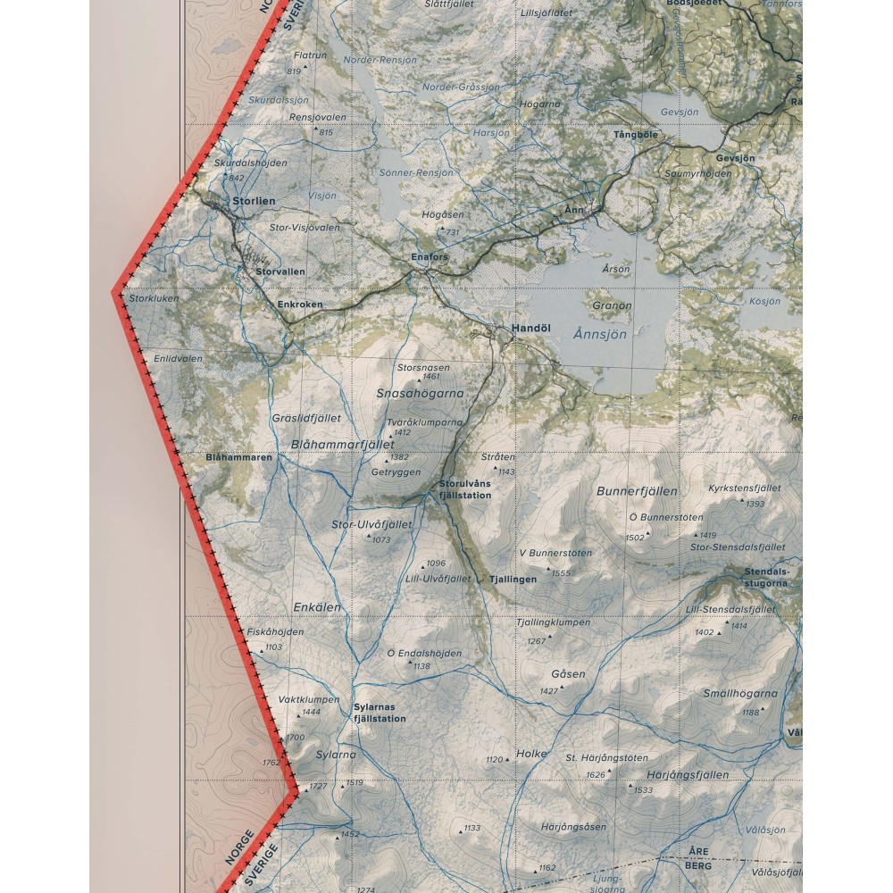 Väggkarta i stående format över Jämtlandsfjällen – ett av Sveriges mest vidsträckta och variationsrika fjällområden, där öppna högfjäll, markanta toppar och långa dalgångar formar ett storskaligt och sammanhängande landskap.
