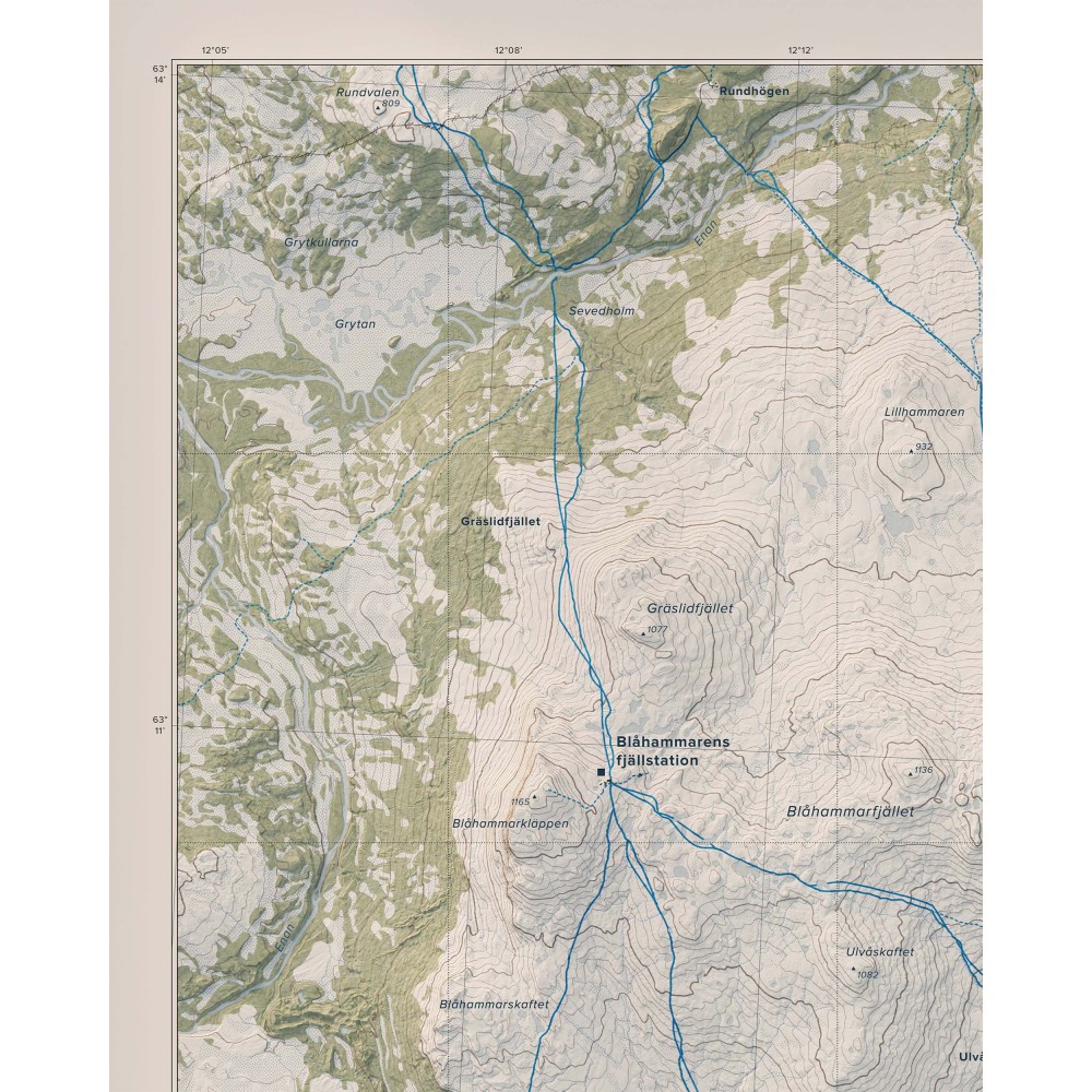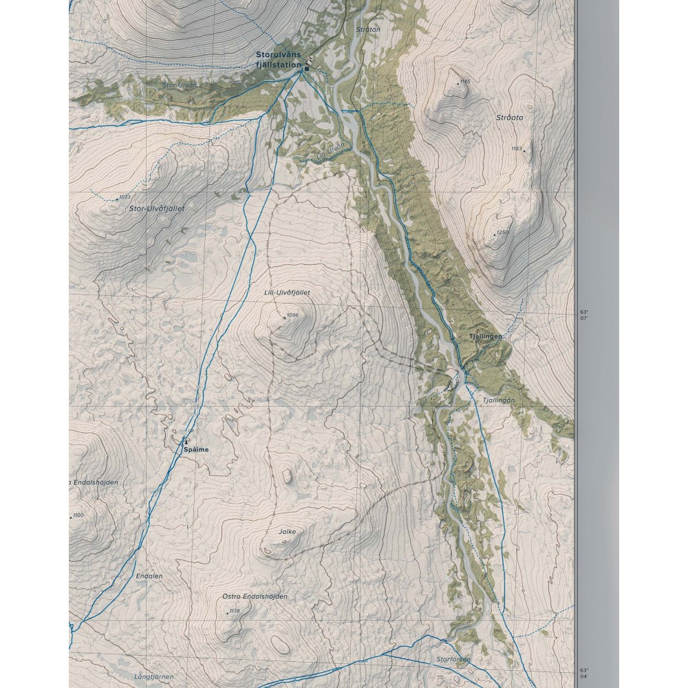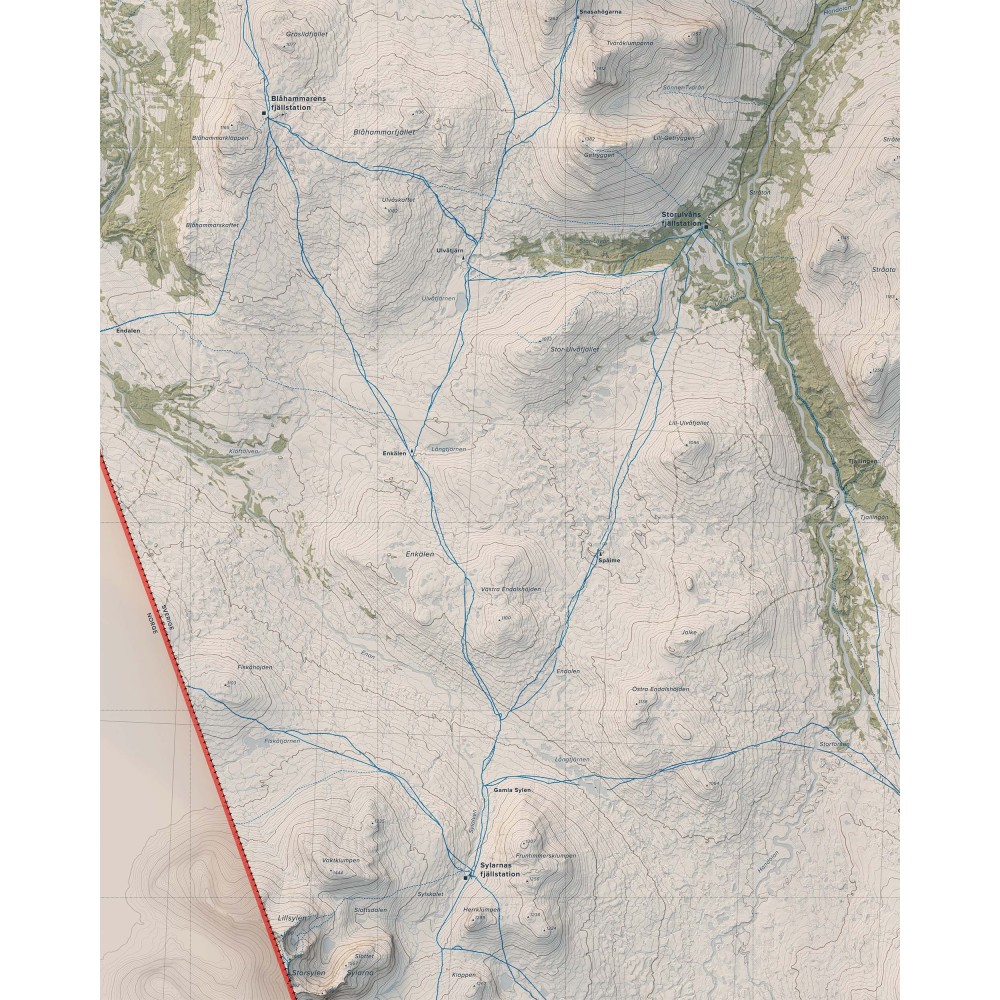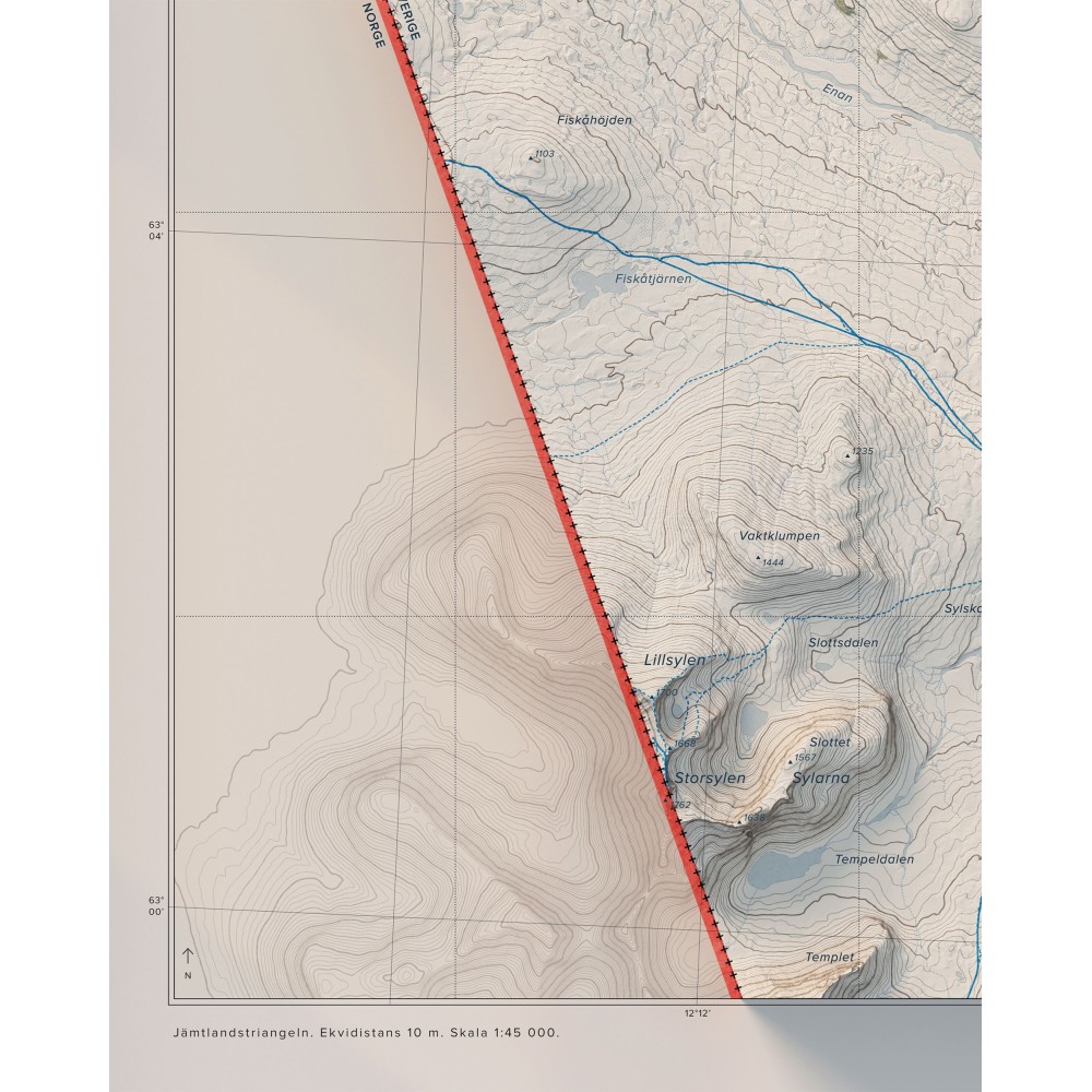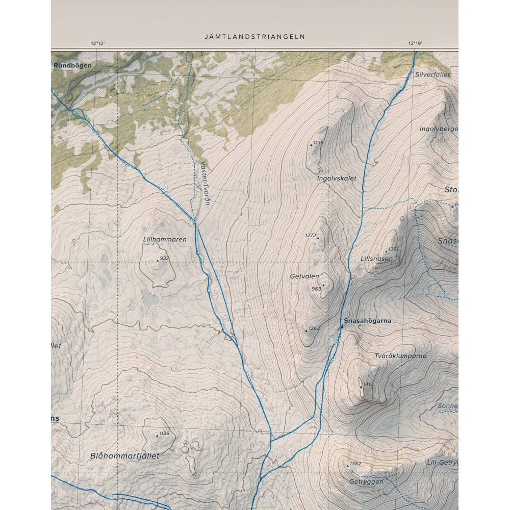 Väggkarta i stående format över Jämtlandstriangeln – ett av Sveriges mest klassiska och lättillgängliga fjällområden, känt för sin sammanhängande vandringsterräng, öppna fjällvidder och storslagna natur.