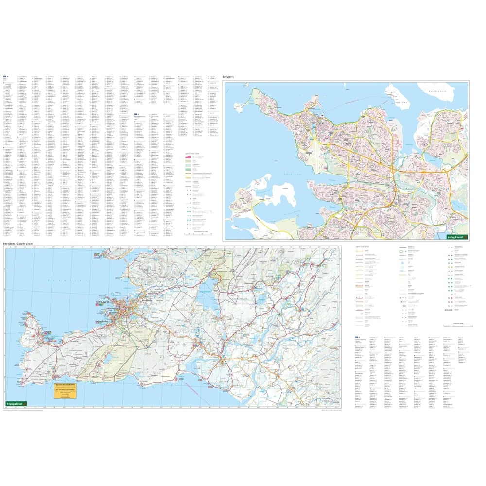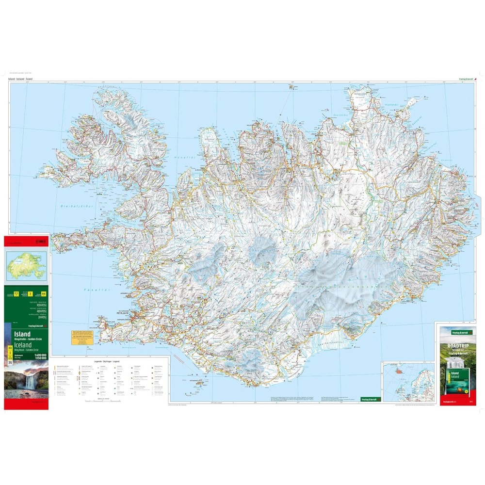 Detaljerad väg- och fritidskarta över Island. Kartan har en skala på 1:400 000 och inkluderar även mer detaljerade kartor över Golden Circle (1:150 000) och en stadskarta över Reykjavík (1:20 000).