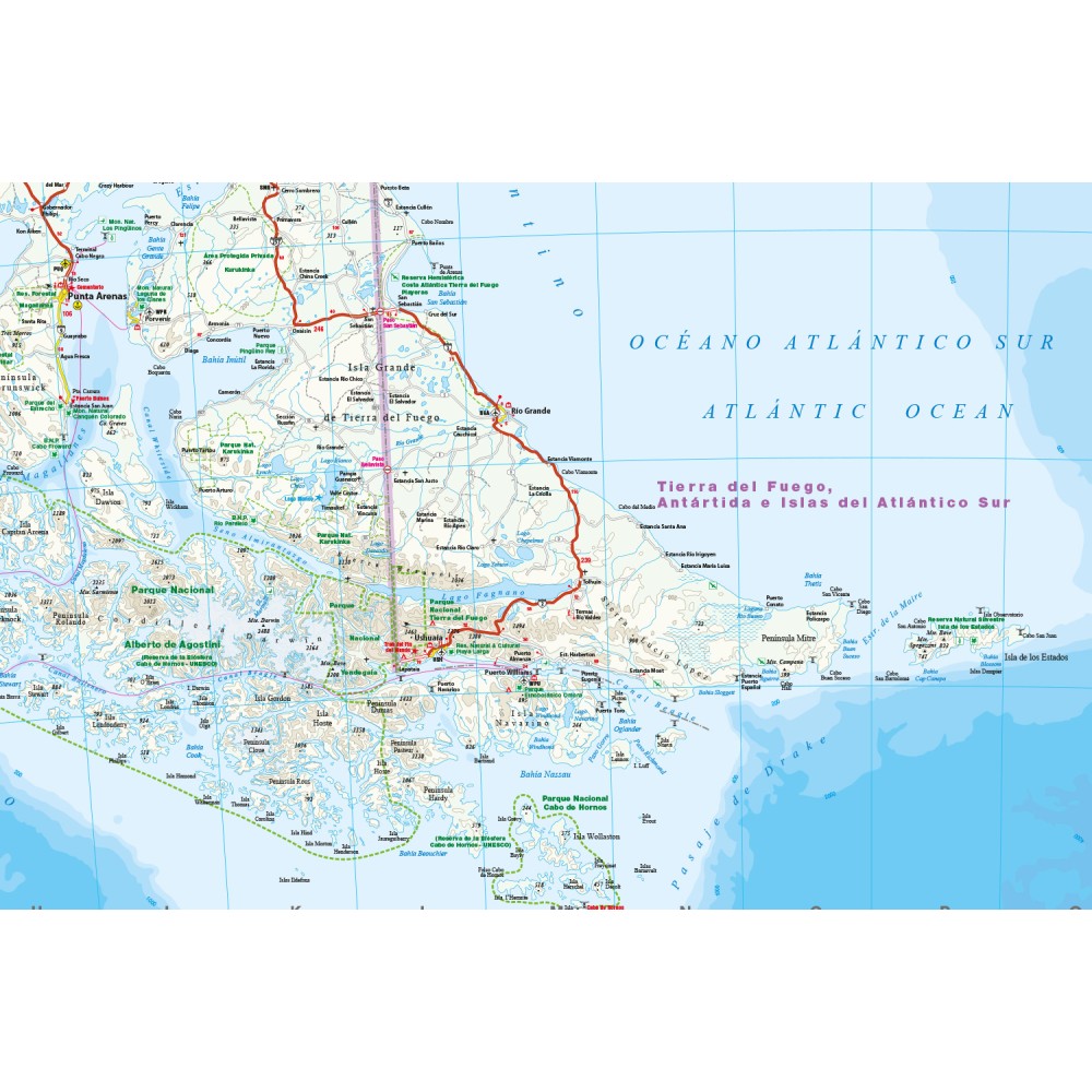 Slitstark och helt vattentät karta över Patagonien och Eldslandet. Tryckt på tåligt plastpapper som går att skriva på. Avtagbart omslag gör kartan smidig att ta med utan extra skydd.