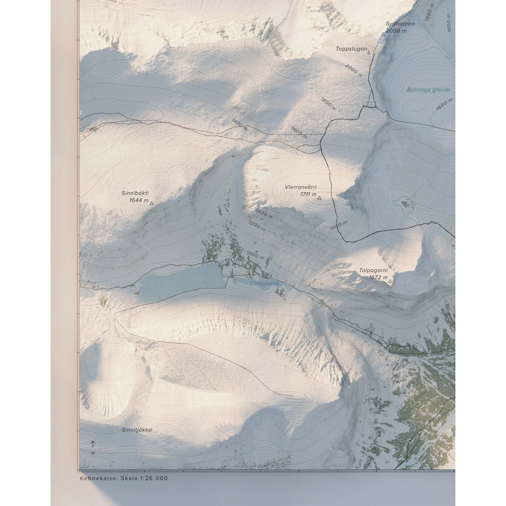 En detaljrik fjällkarta i skala 1:26 000 över Kebnekaise med dess omgivande miljö. Väggkarta i formatet 40×50 cm.