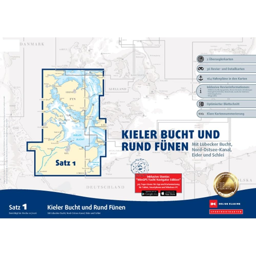 Der Satz 1 der Delius Klasing Sportbootkarten enthält 2 Überseglerkarten sowie 36 Revier- und Detailkarten zur Navigation im Bereich Kieler Bucht, Rund Fünen, für die Lübecker Bucht, den Nord-Ostsee-Kanal, die Eider und die Schlei.