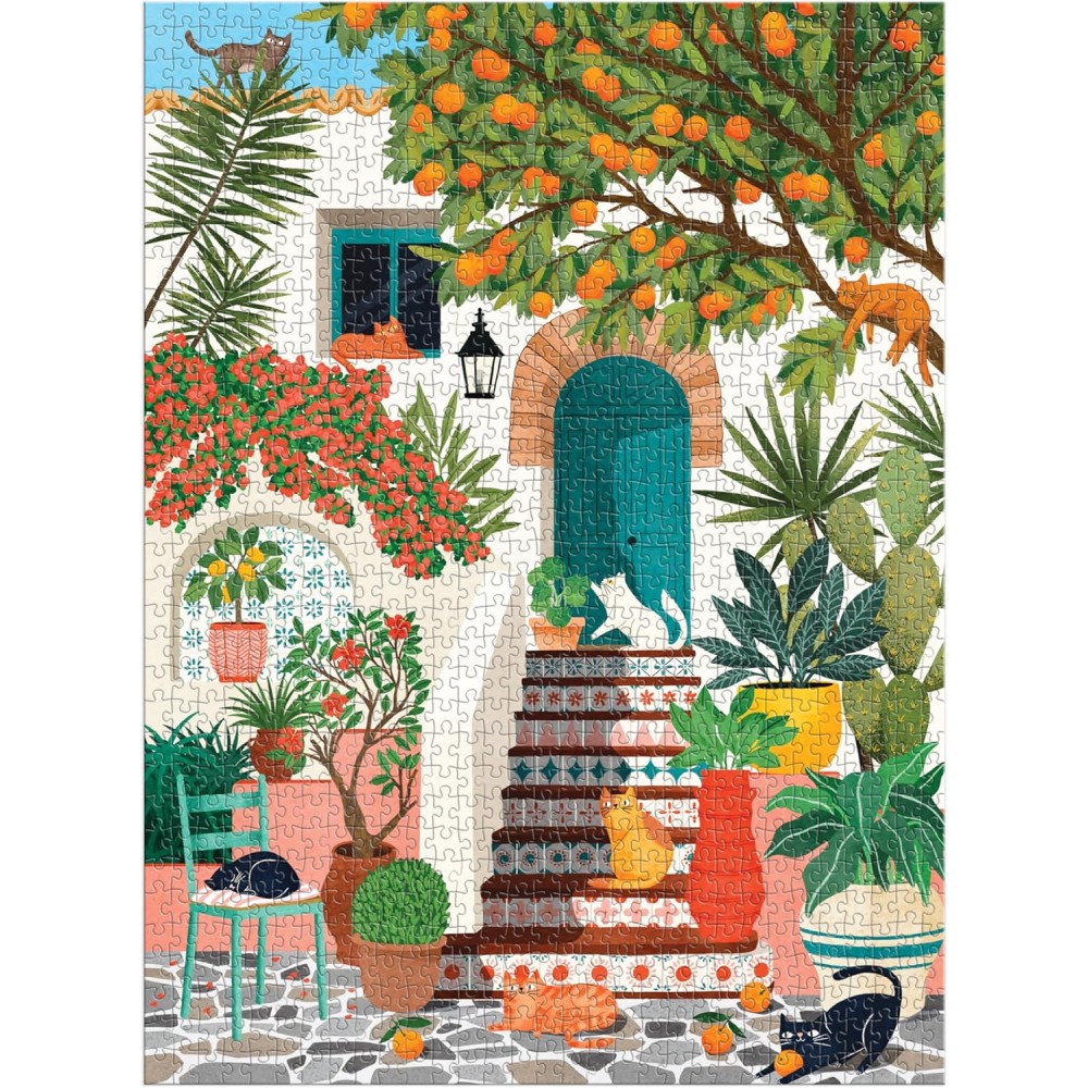 Experience the warmth and beauty of Mediterranean living through Tania Garcia's enchanting illustration in this 1000-piece puzzle. The scene depicts contented cats lounging around a charming coastal home, surrounded by lush orange trees, beautiful architecture, and artfully designed steps that evoke the region's timeless appeal. Rich, inviting colors and intricate details create an immersive puzzle experience that transports you to sun-soaked European landscapes.