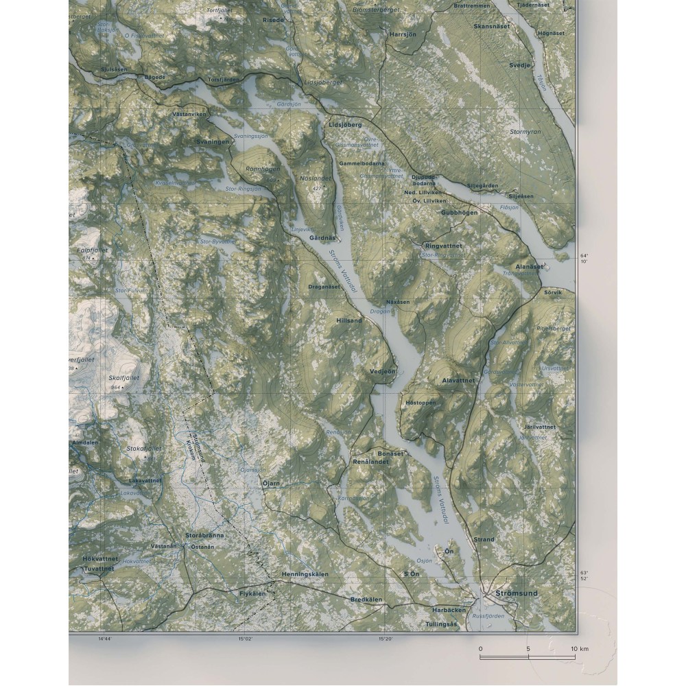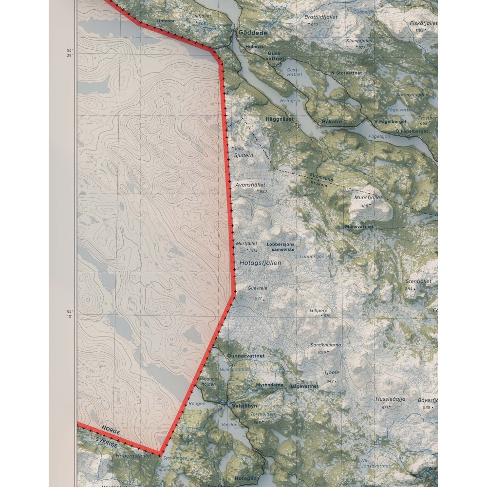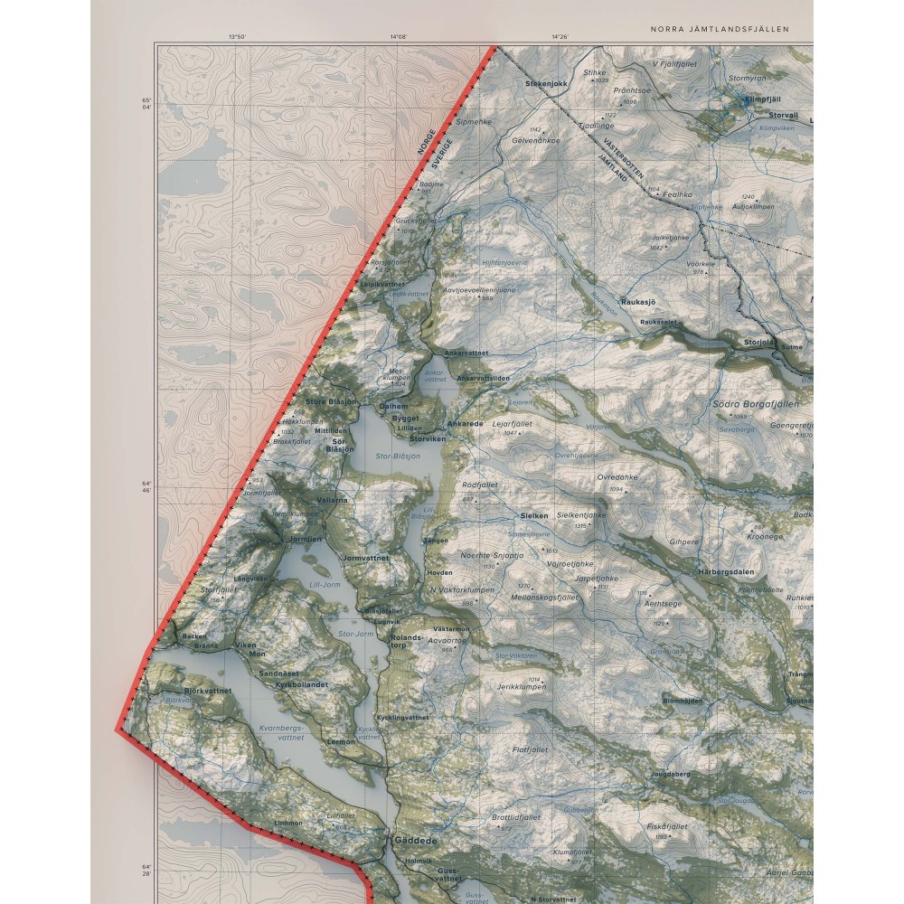 Väggkarta i stående format över Norra Jämtlandsfjällen – en vidsträckt och variationsrik del av Jämtlands fjällvärld, där öppna högfjäll, markerade toppar och djupa dalgångar bildar ett storskaligt och sammanhängande landskap.