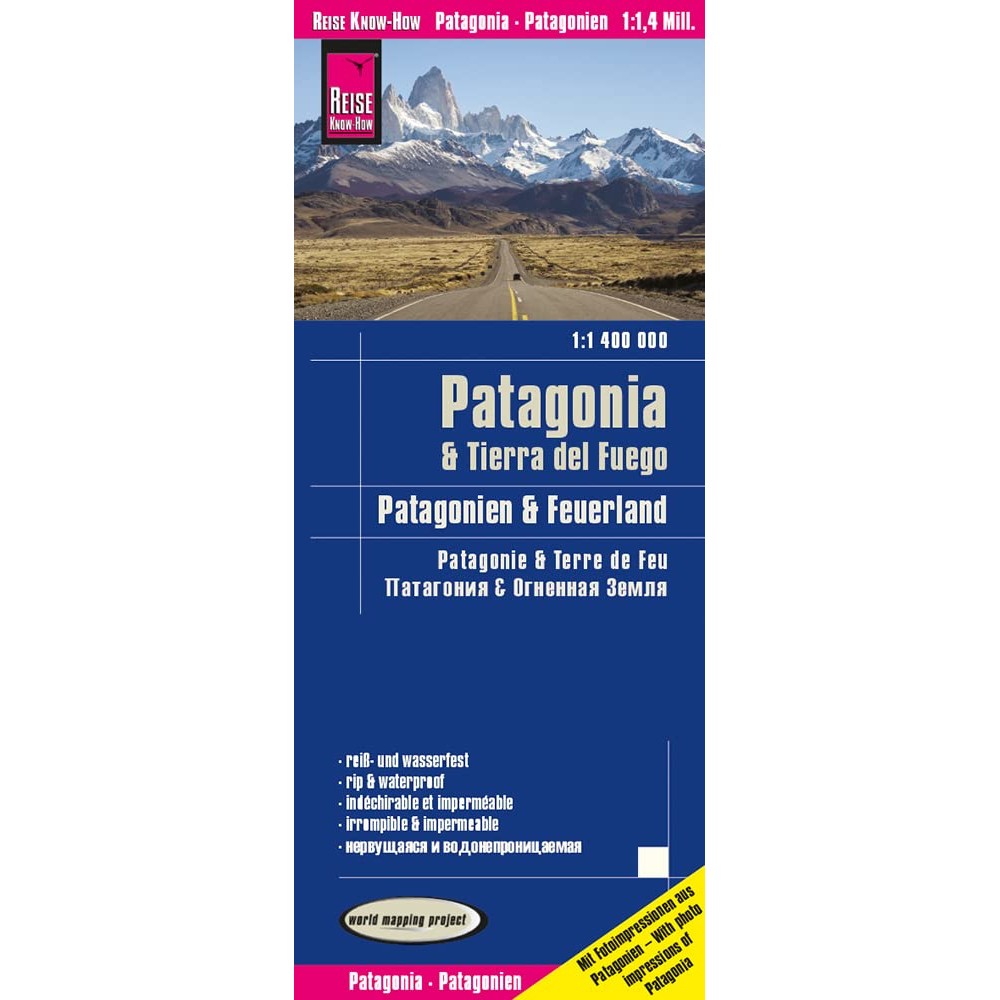 Slitstark och helt vattentät karta över Patagonien och Eldslandet. Tryckt på tåligt plastpapper som går att skriva på. Avtagbart omslag gör kartan smidig att ta med utan extra skydd.