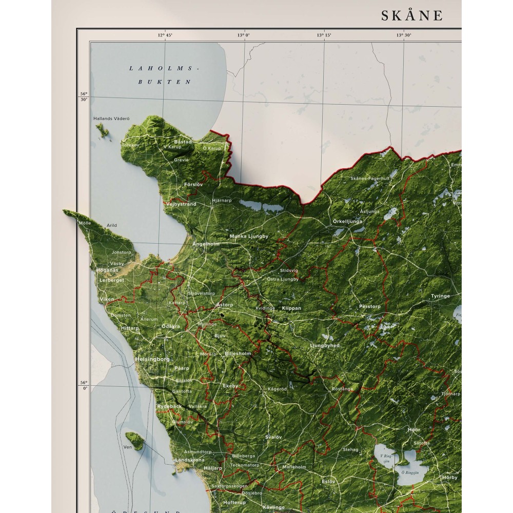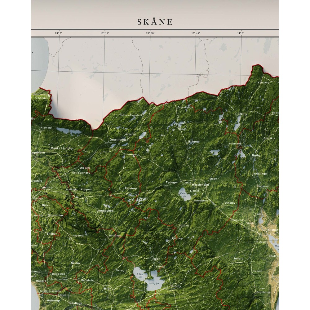 En detaljrik och naturtrogen väggkarta över Skåne. Format 40×50 cm eller 50×70 cm.
