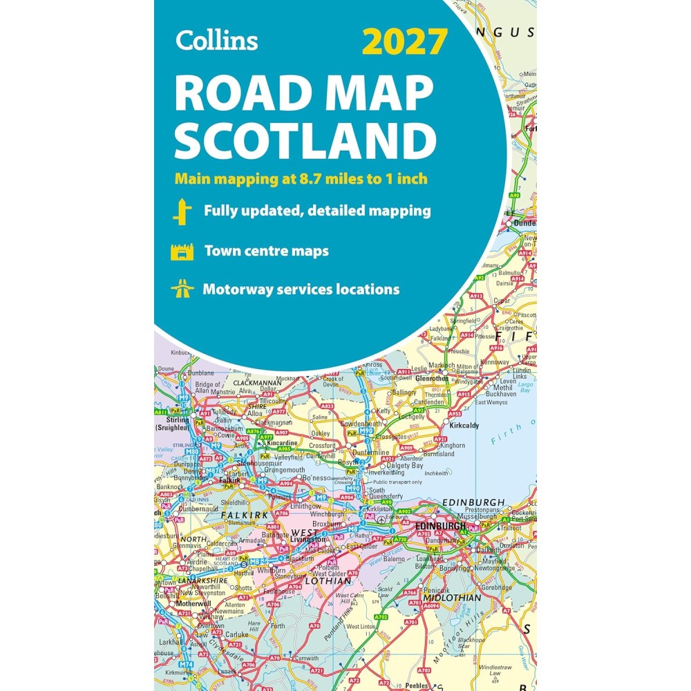 Kartan har ett detaljerat vägnät för enkel ruttplanerin och administrativa områden som visas i färg. Kartan täcker hela Skottland och en del av norra England på ena sidan.
