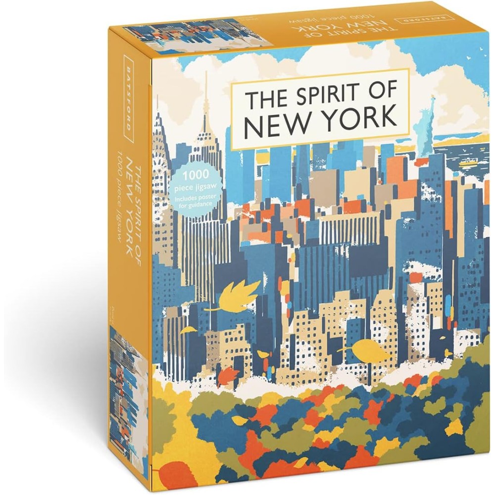 1000-piece jigsaw puzzle of an iconic New York illustration, inspired by classic Batsford book covers of the 1930s and 40s.