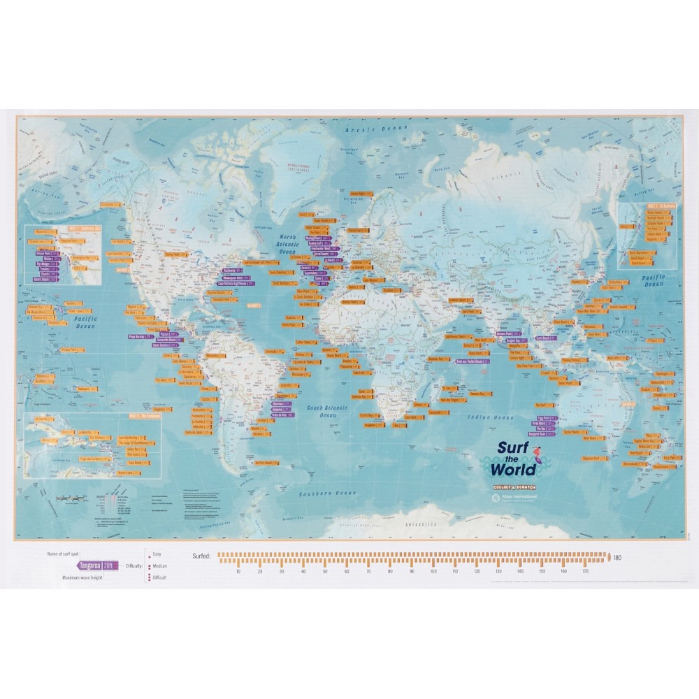 This Collect and Scratch print shows the 180 most famous surf spots in the world, with their name, difficulty level and maximum wave height. Scratch off the surf spots you have visited and keep track of how many you have done, or still have to surf.