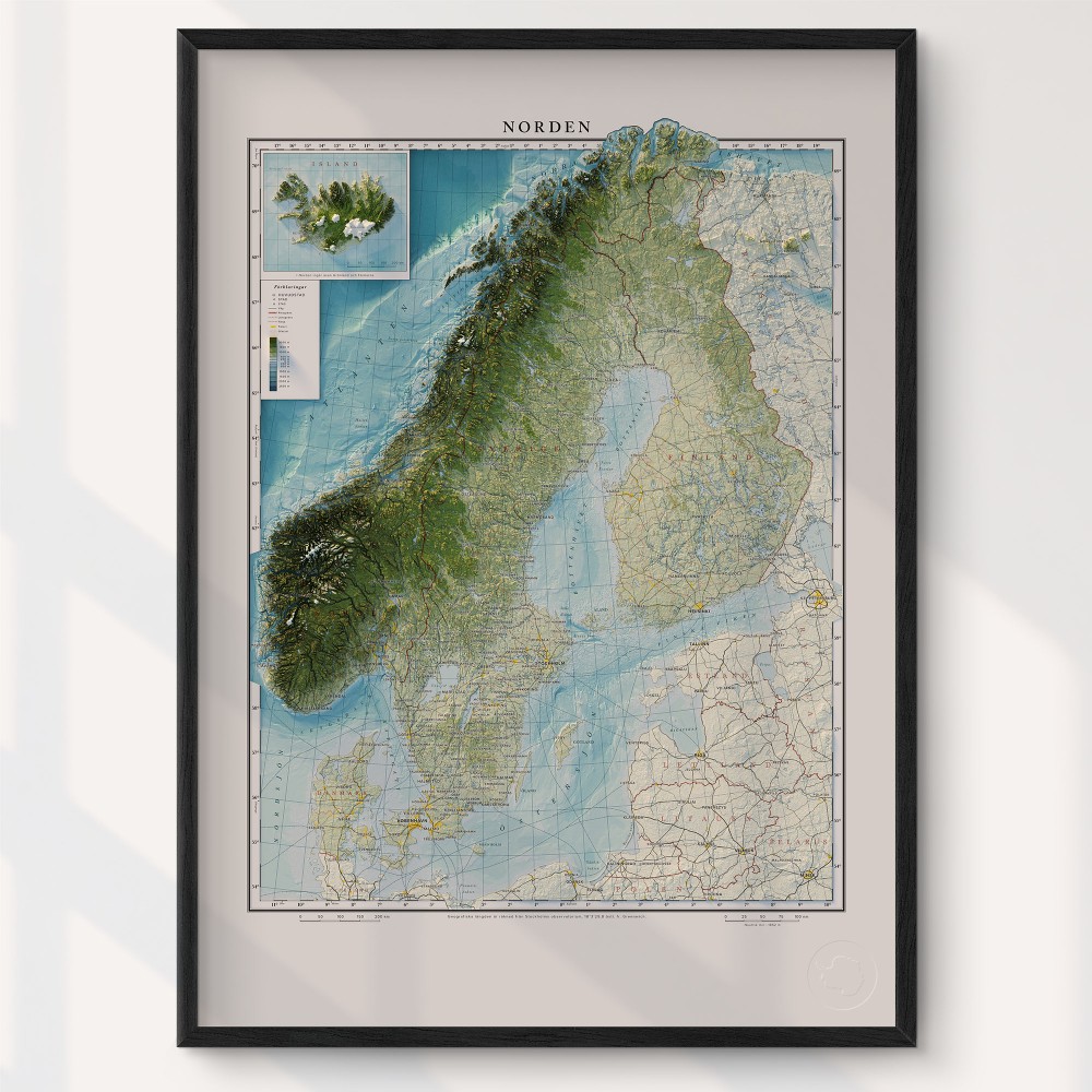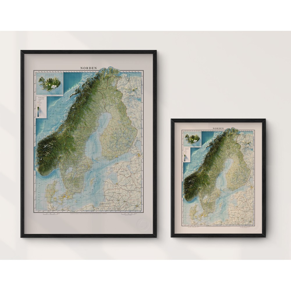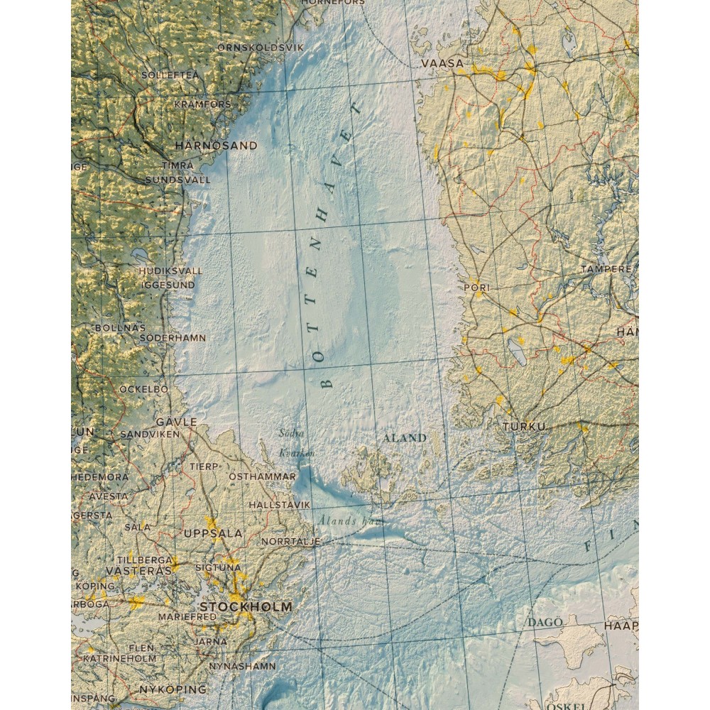 Väggkarta över Sverige med omgivande länder i Norden. Motivet är skapad med hjälp av verkliga höjddata och djupdata (terrängen under havsytan).