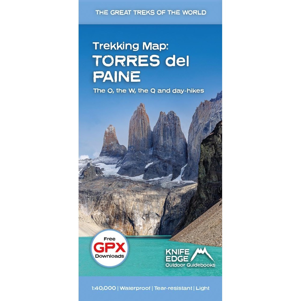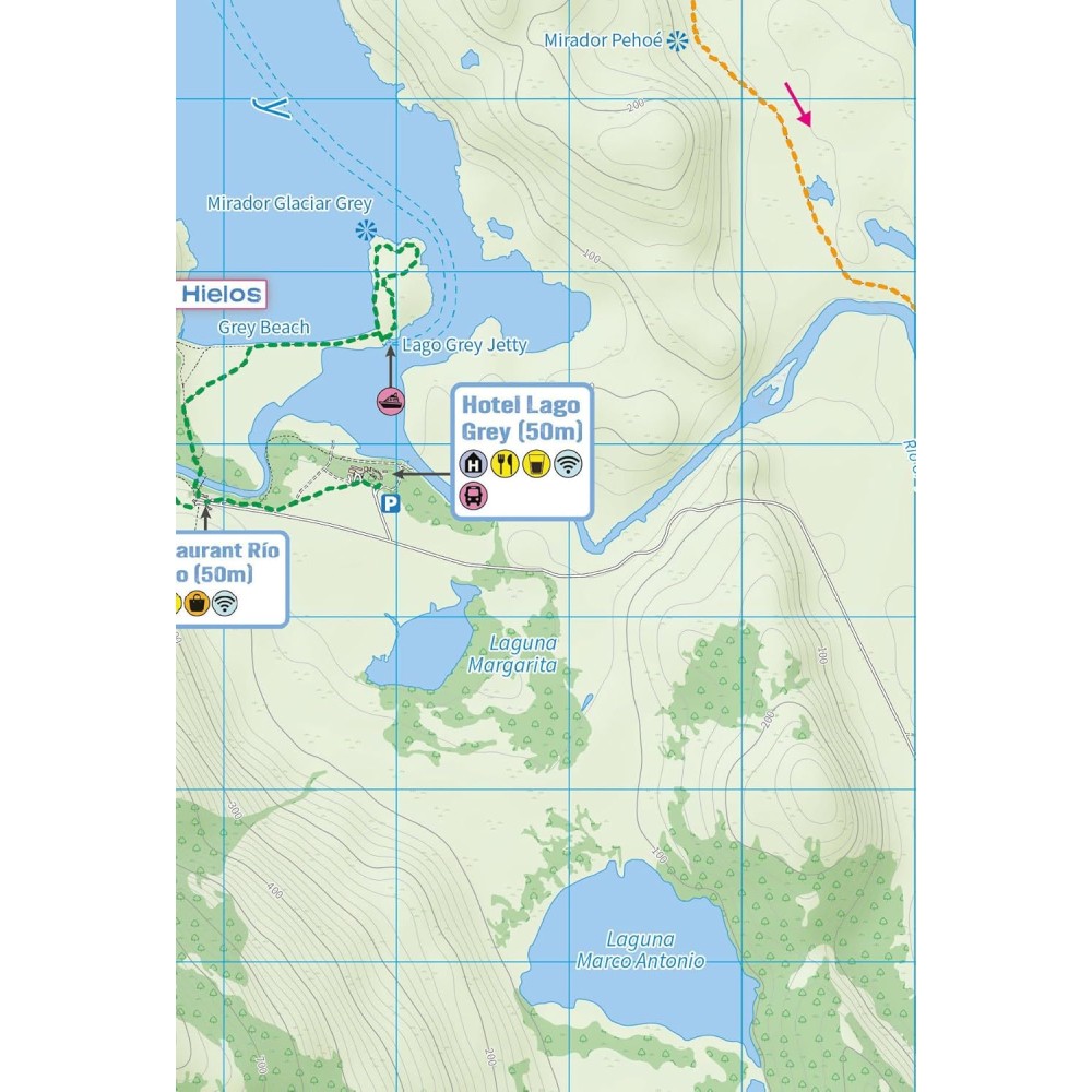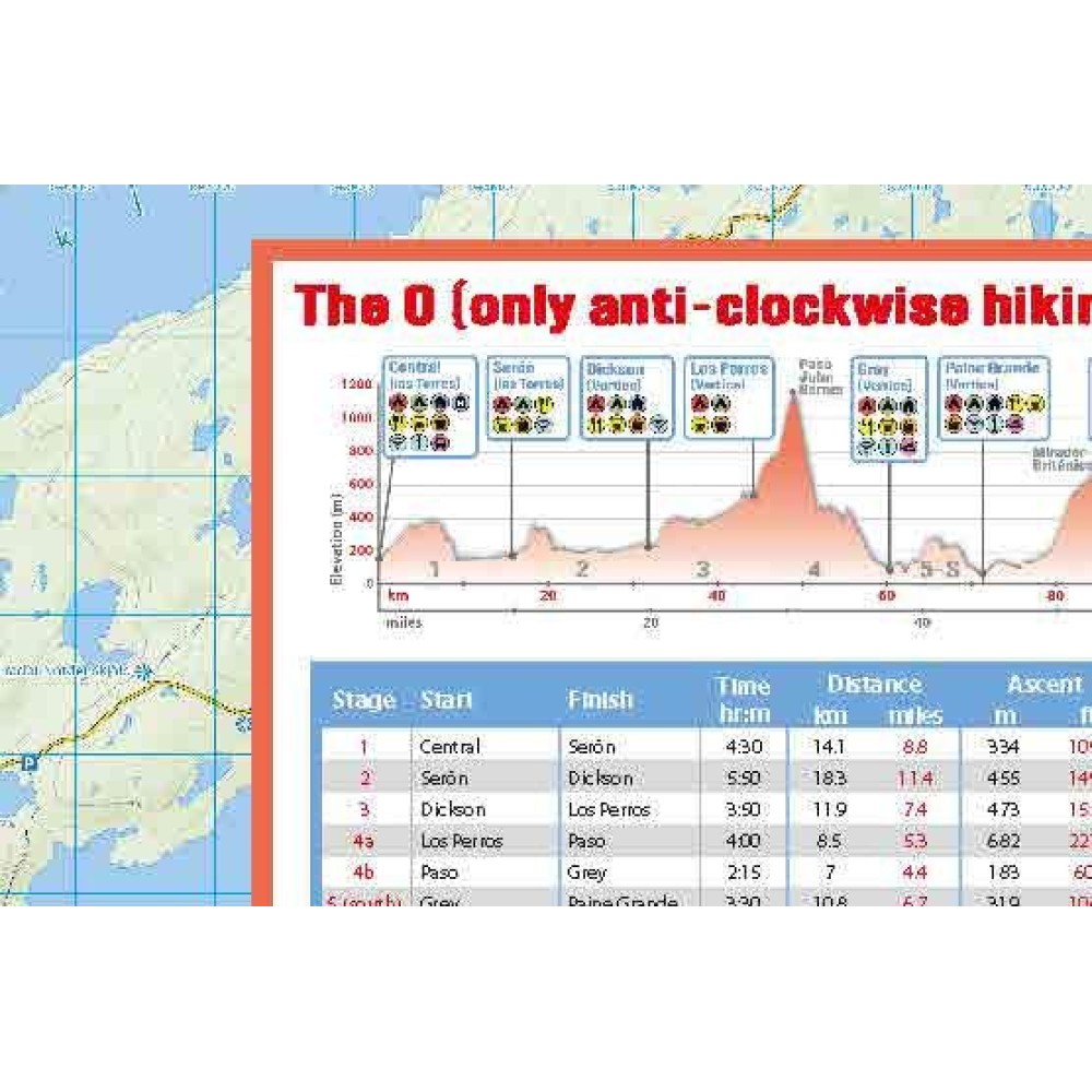 Detaljerad karta över Torres del Paine i skala 1:40 000 som visar vandringslederna O, W och Q samt dagsturer. Kartan markerar boende, matställen och transportmöjligheter och innehåller även höjdprofiler samt information om avstånd, tidsåtgång och höjdskillnader för varje etapp. GPS kompatibel karta med möjlighet att ladda ner GPX filer för lederna.