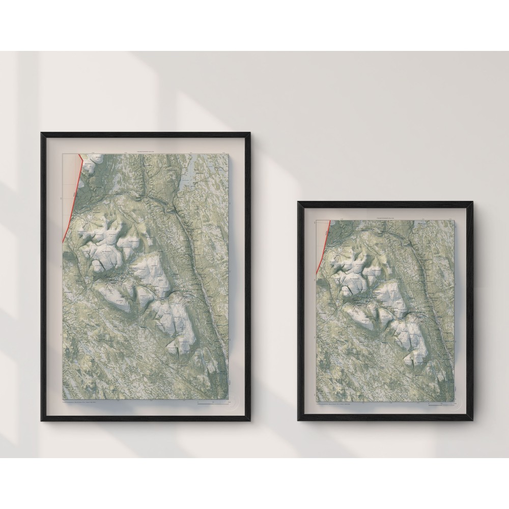 En detaljerad översiktskarta i flera format. 3D-renderad och giclée-tryckt på premiumpapper, vilket skapar en unik 3D-illusion i 2D.