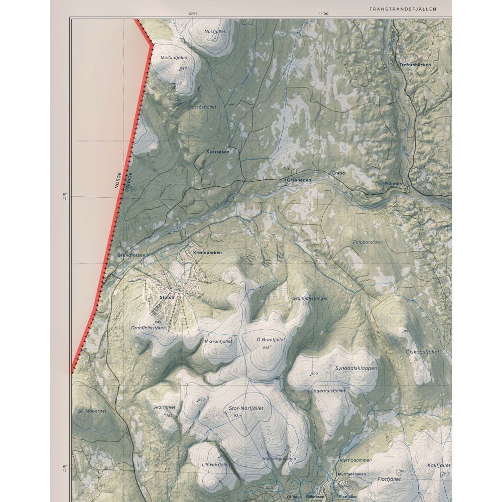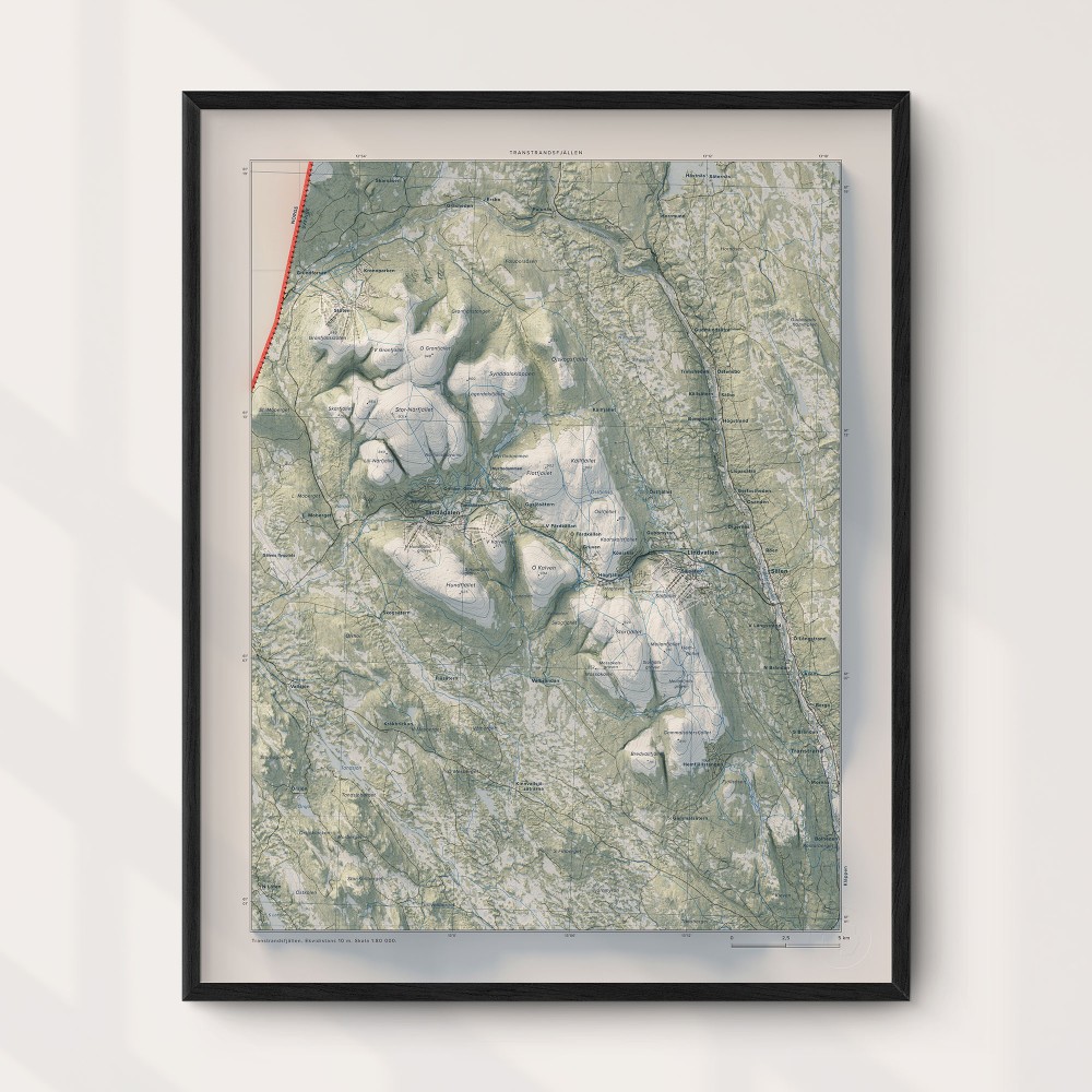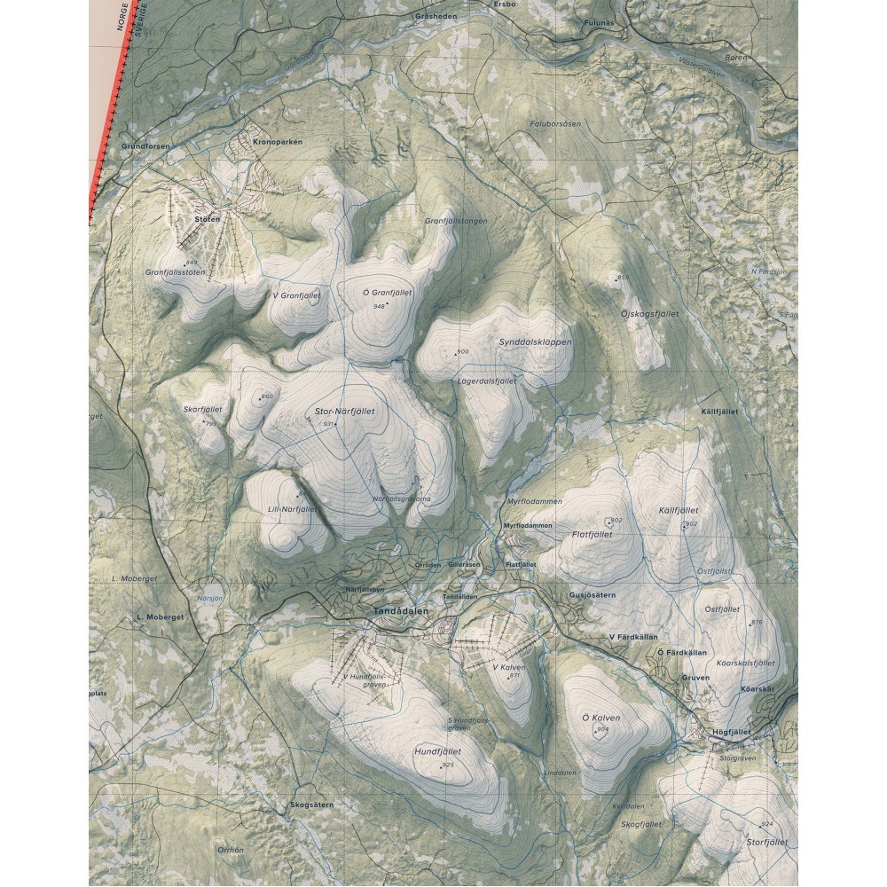 Väggkarta i stående format över Transtrandsfjällen – ett böljande fjäll- och skogslandskap i nordvästra Dalarna, där lågfjäll, dalgångar och vidsträckta skogsområden möts.