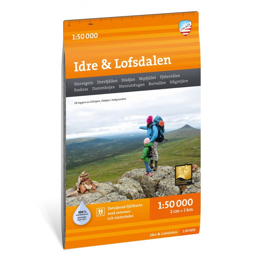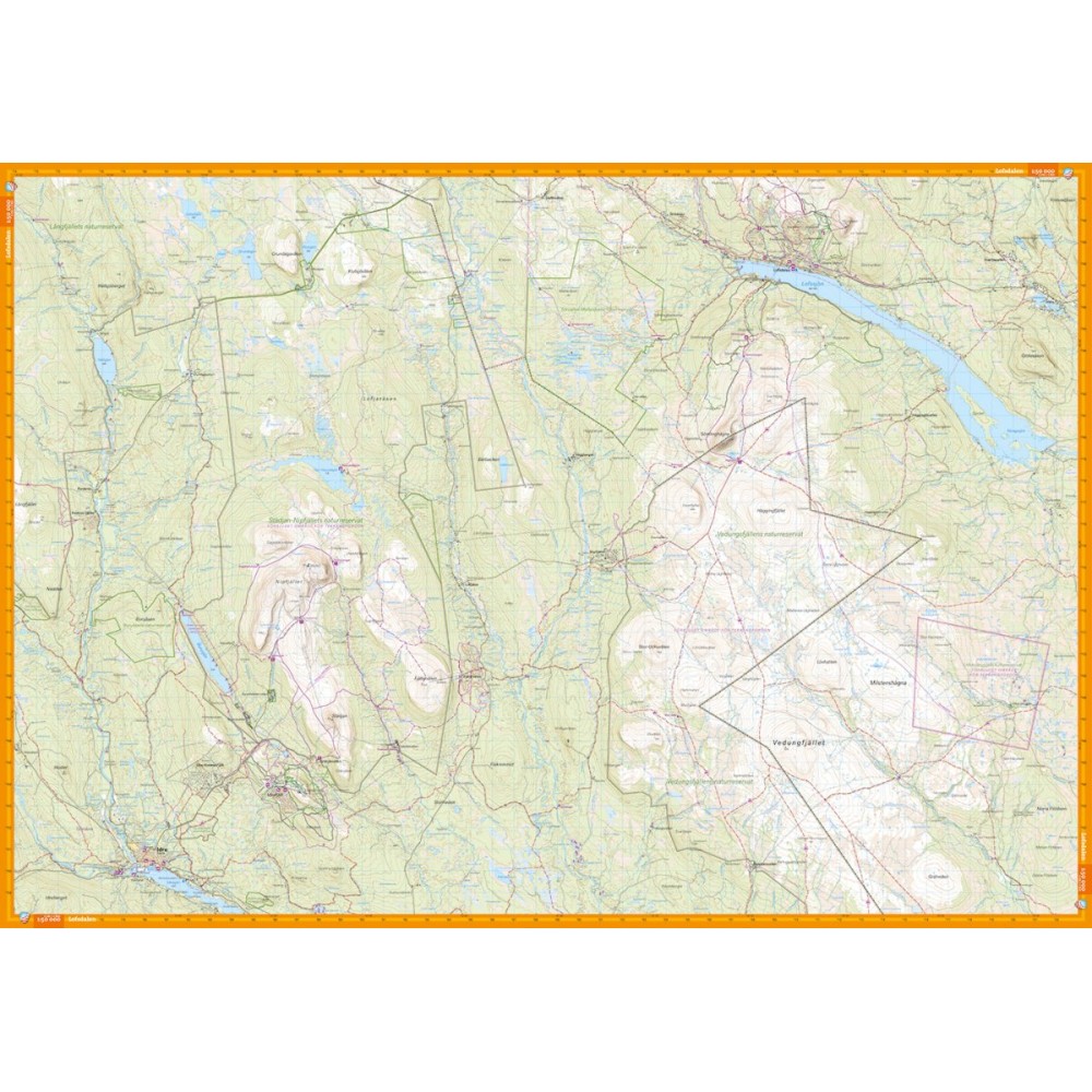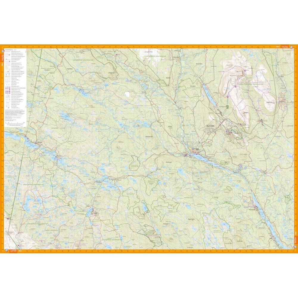 Stort utsnitt från Lofsdalen i nordost till Drevfjällens naturreservat i sydväst, två kartor i ett om man jämför med Lantmäteriets utsnitt. Men även mer detaljer som tydligt markerade preparerade skidspår, stugservice mm.