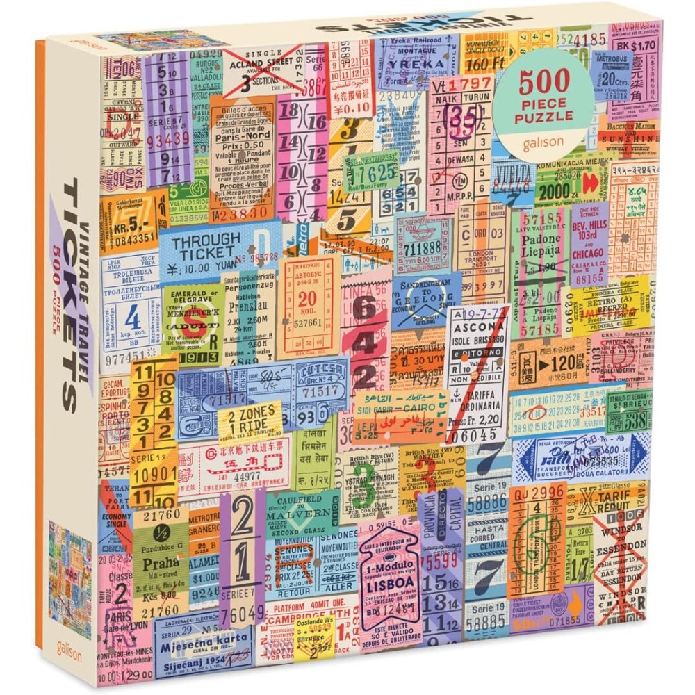 Vintage Travel Tickets 500 bitar pussel från Galison har ett illustrerat collage av olika biljetter